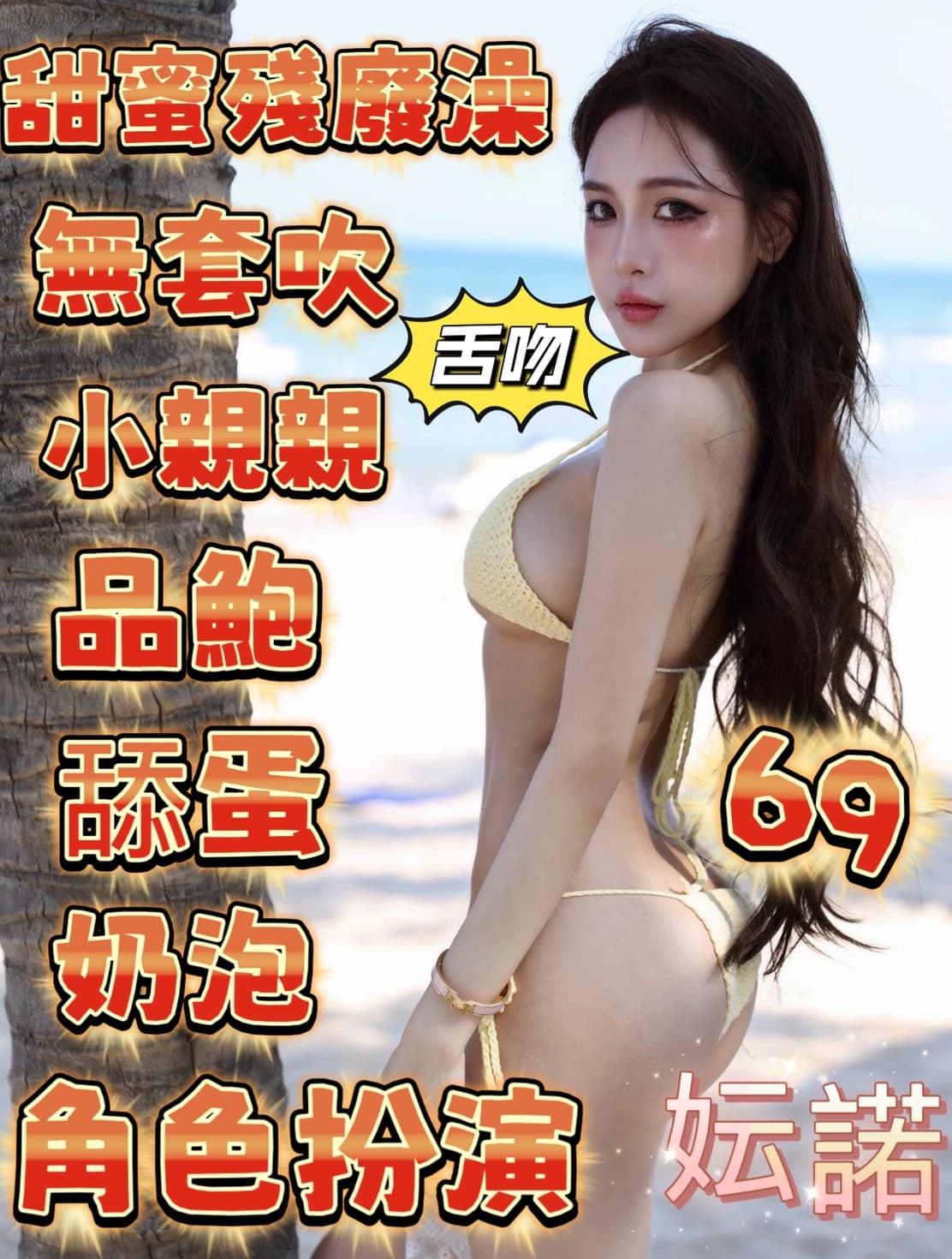 奶炮, 按摩, 69, 殘廢澡, 舌吻(視衛生), 親嘴(視衛生), 無套吹, 品鮑, 舔蛋